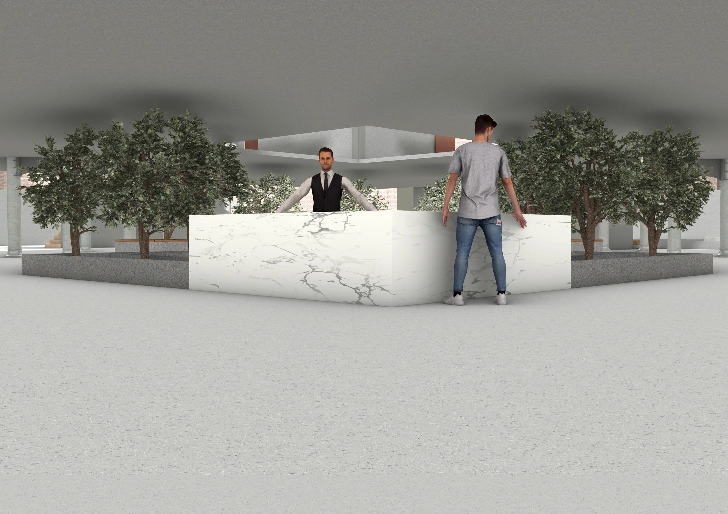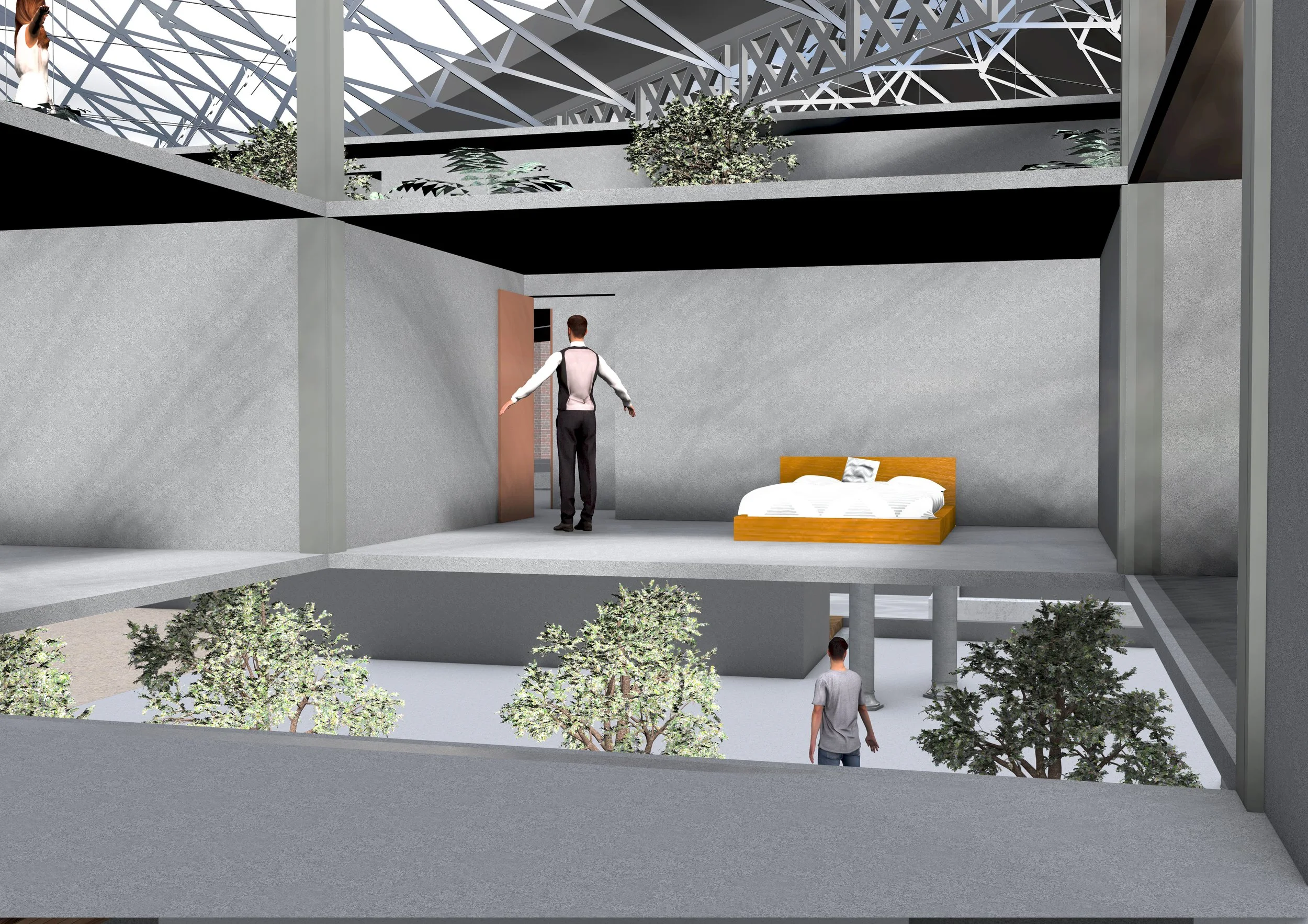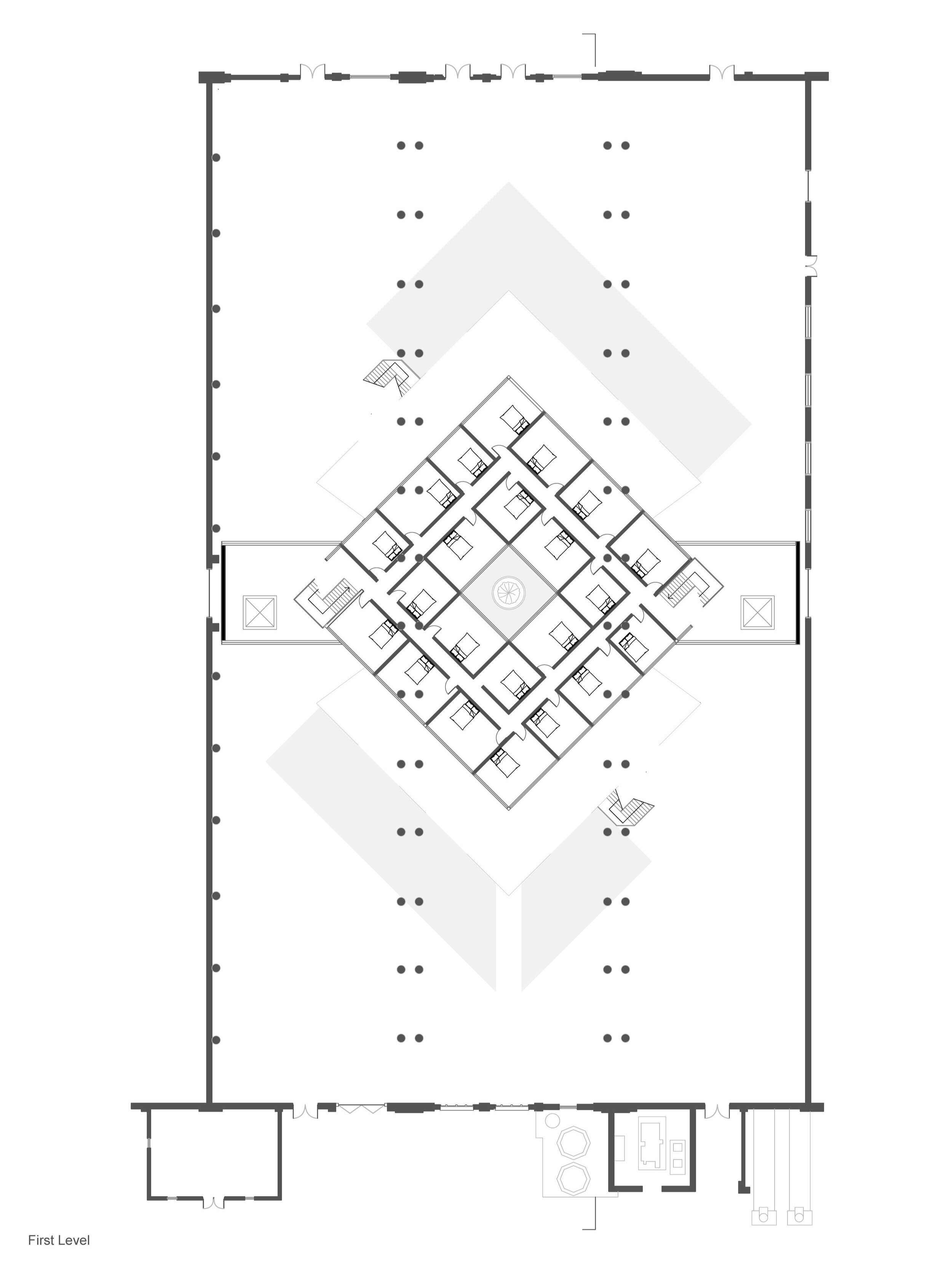 Through the design processes of research, drawings, models and renders outcomes to a hybridized theoretical interior space focusing on the typology of private vs. public and a harsh surface interior. The chandelier square frame rooms rotated on a 45-degree angle with a panorama view of the hotel showcasing the amenities to be explored as rooms and amenities are stripped to a bare minimum forcing individuals to socialize, allowing consumers to set the atmosphere.