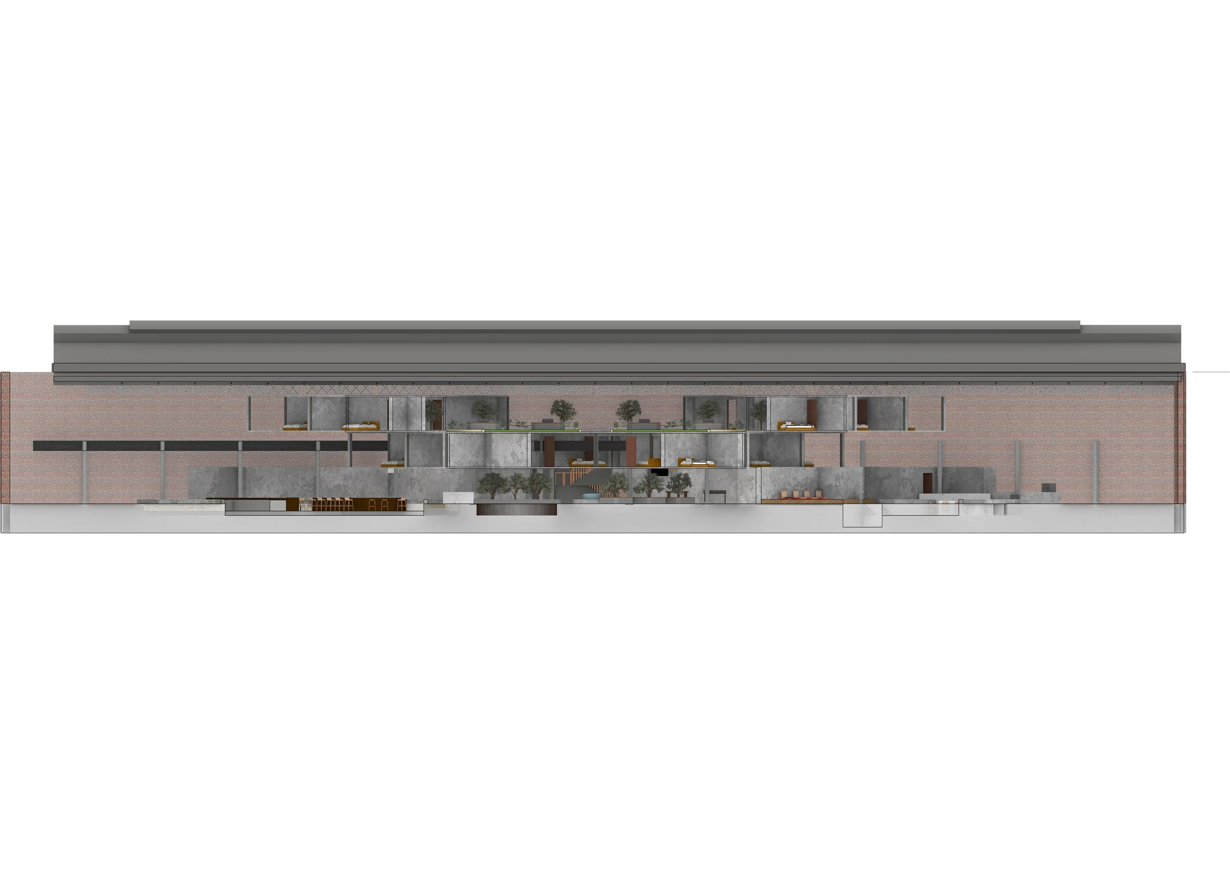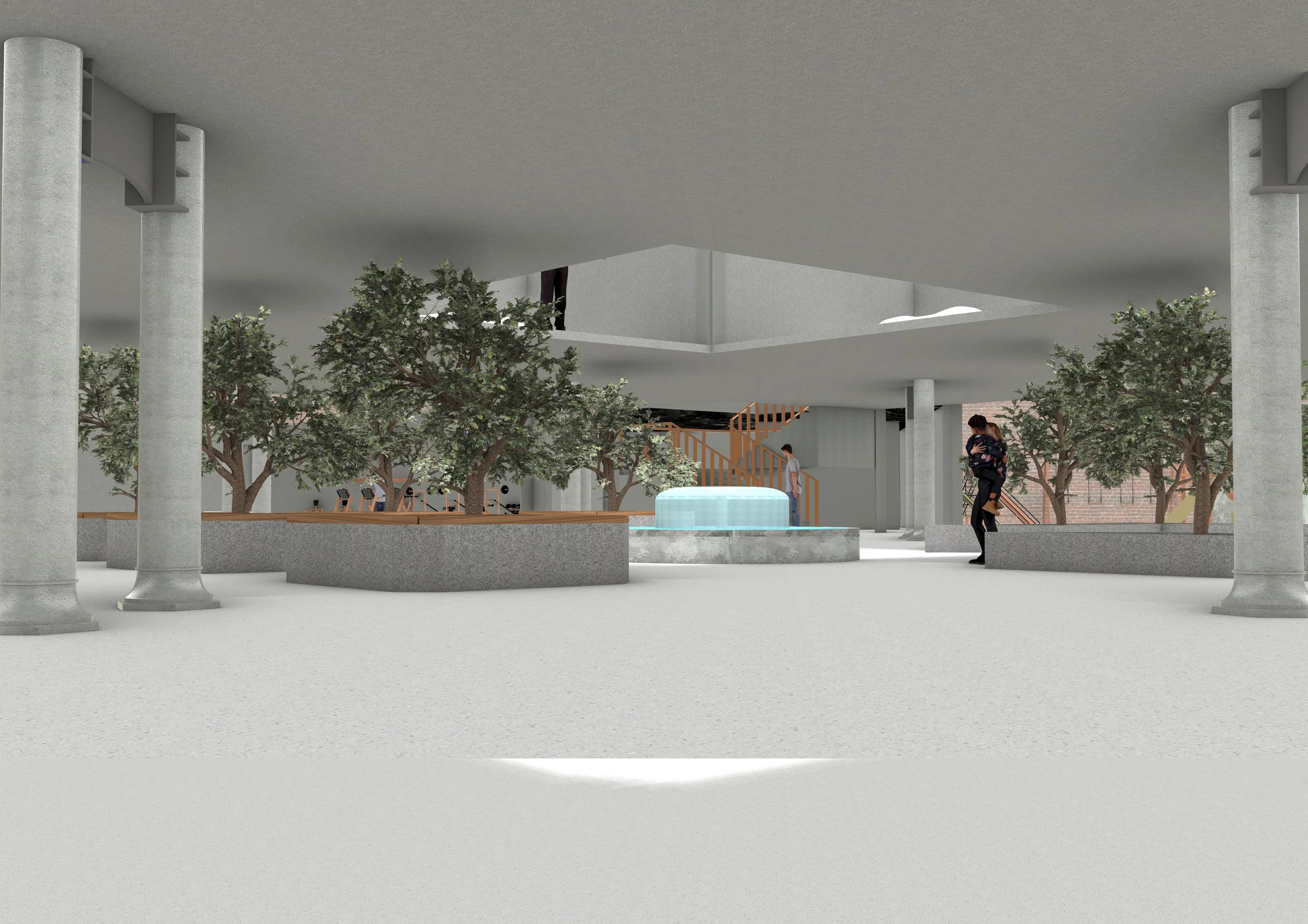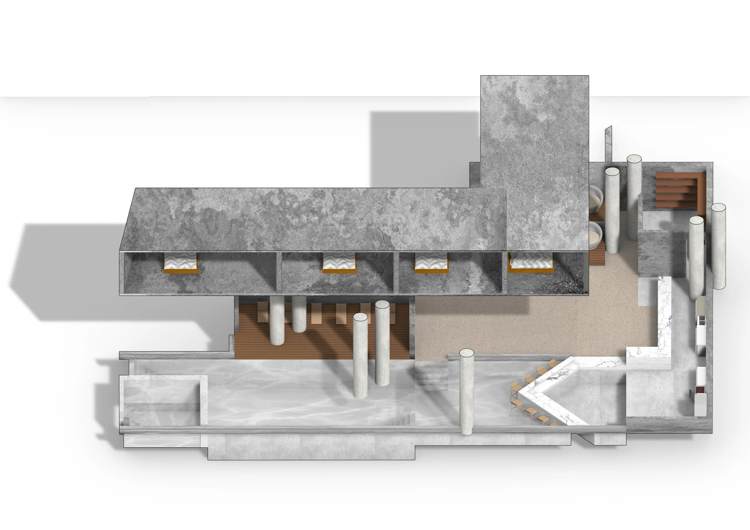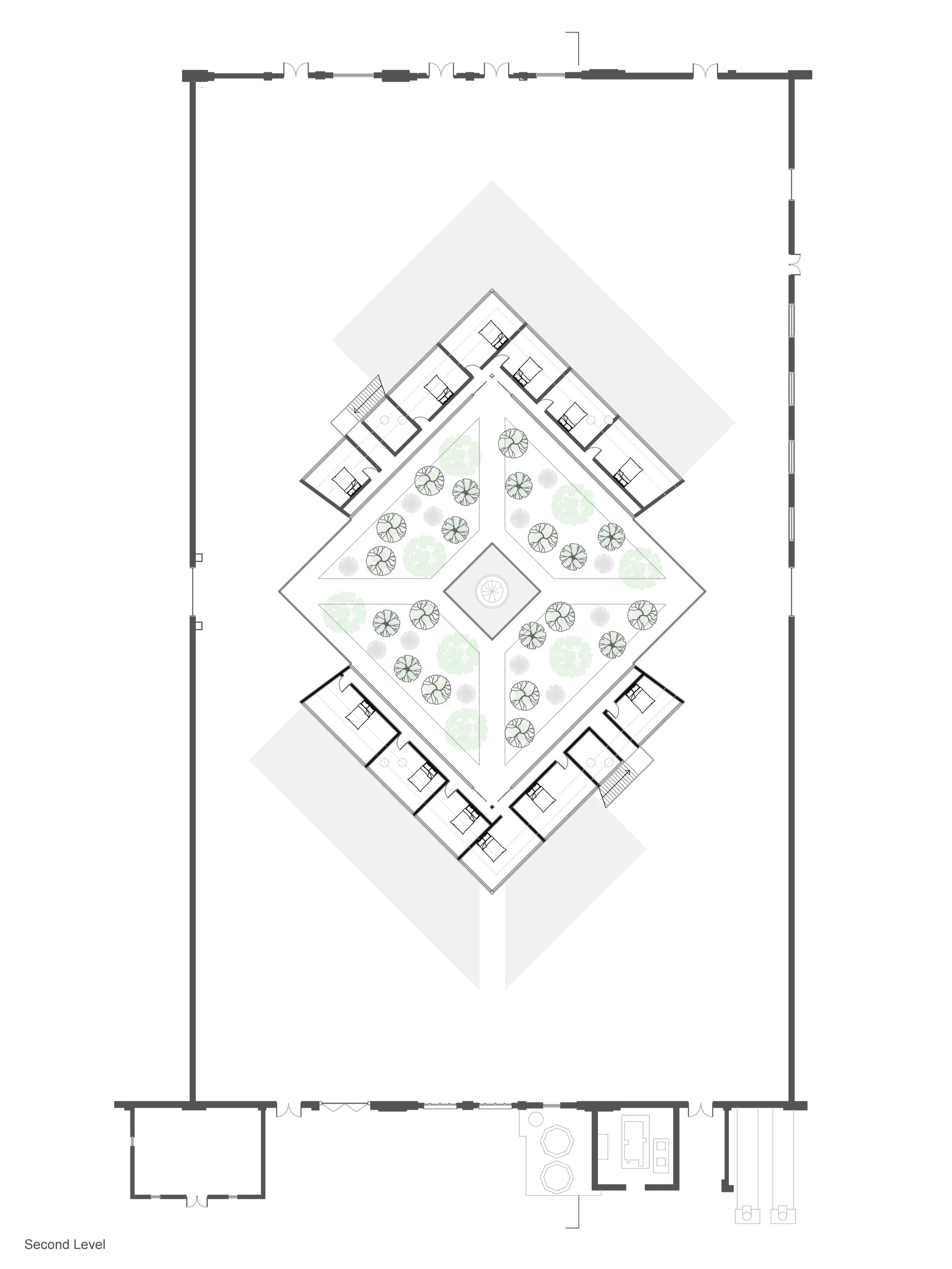Through the design processes of research, drawings, models and renders outcomes to a hybridized theoretical interior space focusing on the typology of private vs. public and a harsh surface interior. The chandelier square frame rooms rotated on a 45-degree angle with a panorama view of the hotel showcasing the amenities to be explored as rooms and amenities are stripped to a bare minimum forcing individuals to socialize, allowing consumers to set the atmosphere.